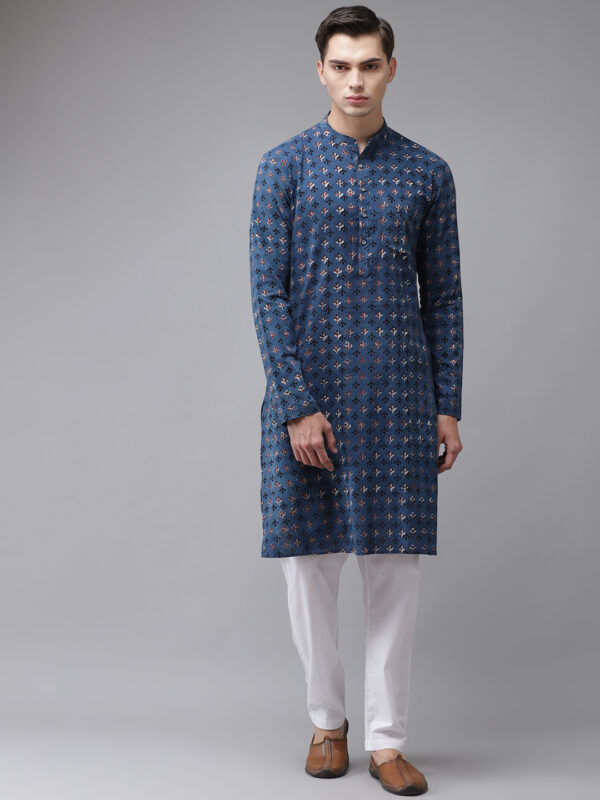 Men Blue And Beige Printed Straight With Kurta Pyjama