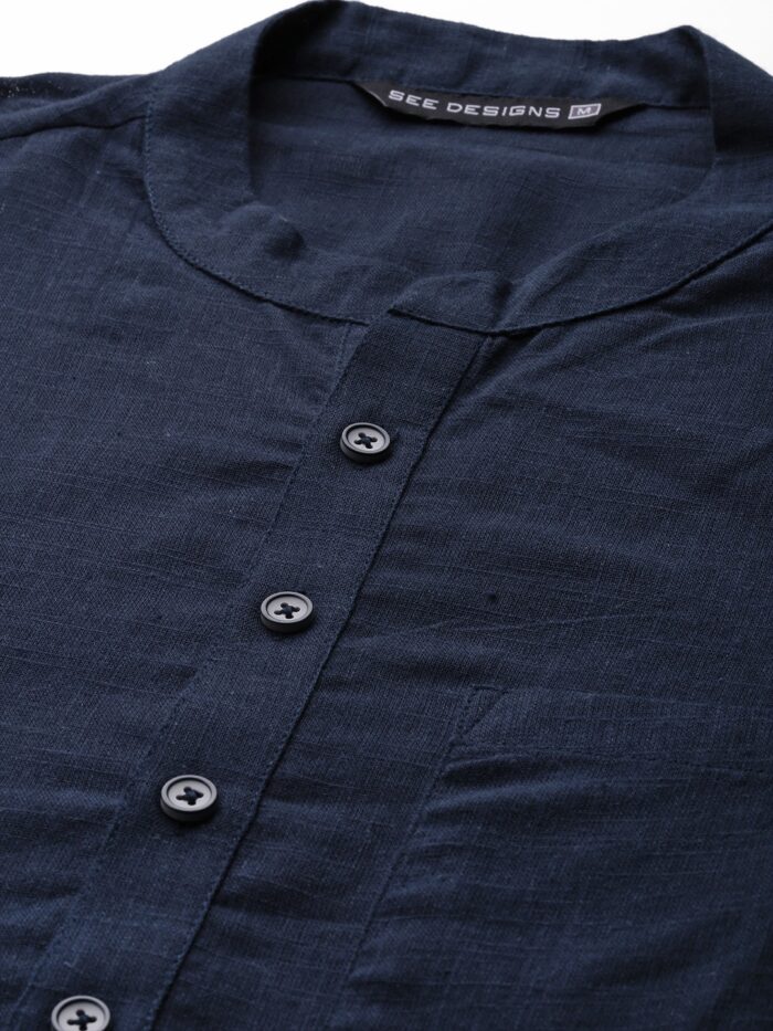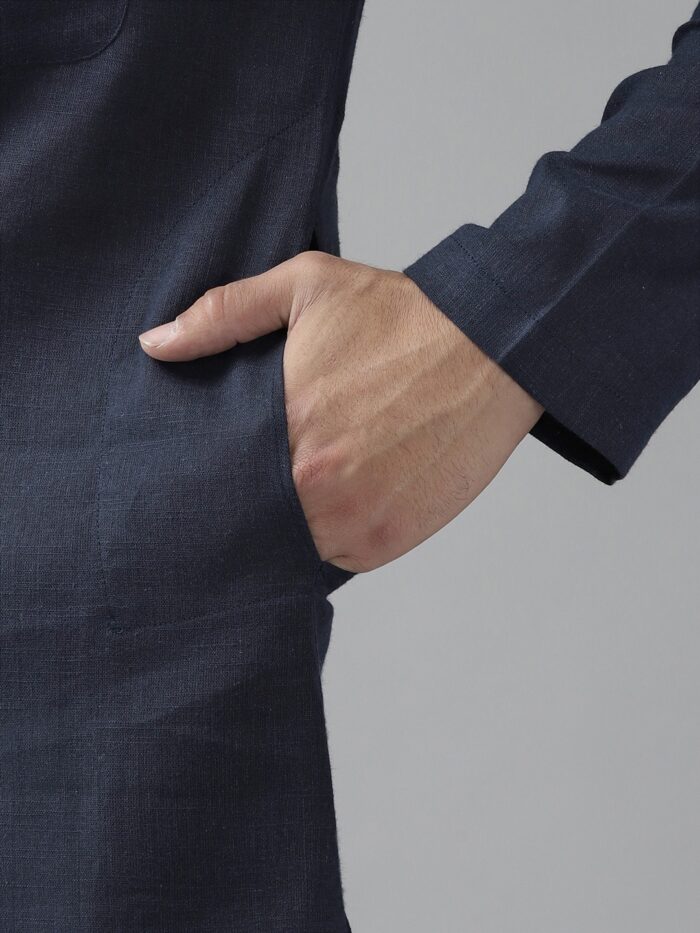Men Blue Cotton Straight Kurta with Slub Effect, Has a madern Collar Stright Hem Side, Full Sleeve Straght Kurta