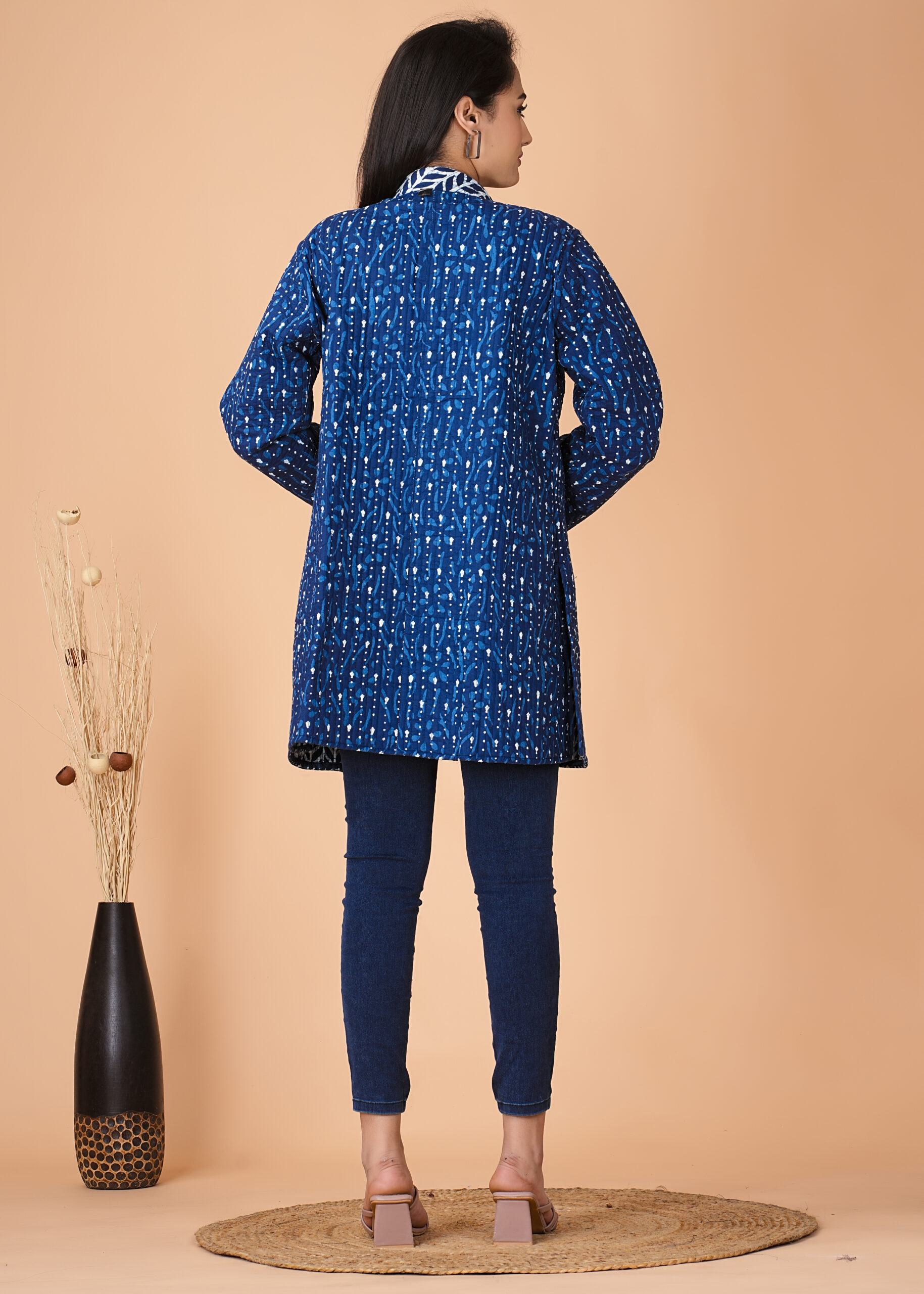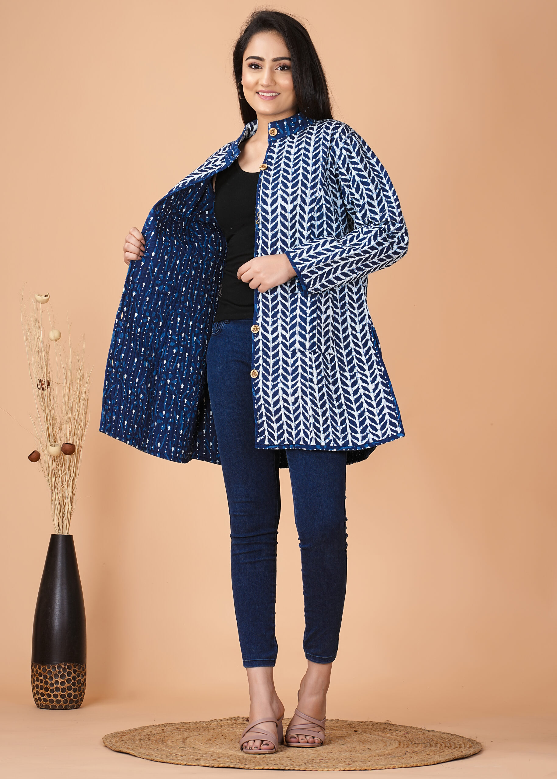 This is a handcrafted Bagru print reversible quilted jacket, Get Smart, Get Stylish with Cotton fabric , Inside Cotton and is prone to colour bleeding due to use of natural dyes. The print on the garment might be uneven- owing to the handcrafted nature of the product, adding essence to the garment.