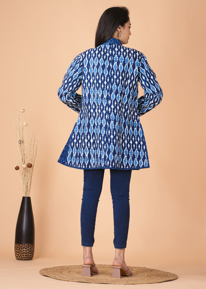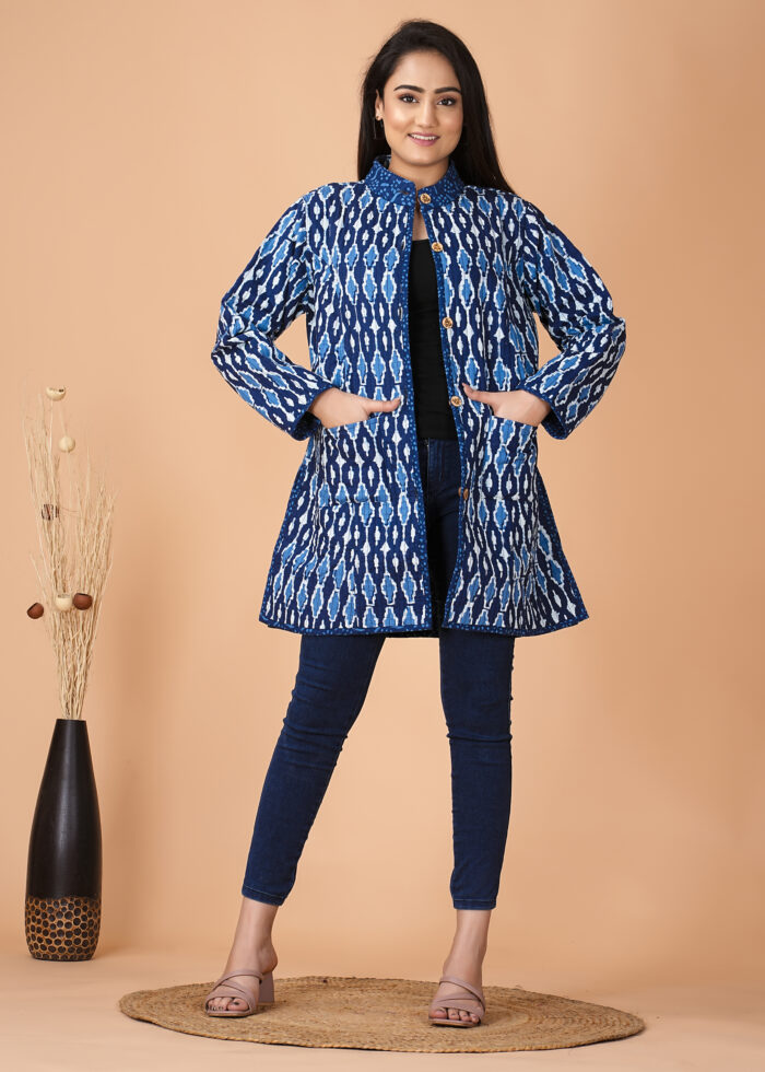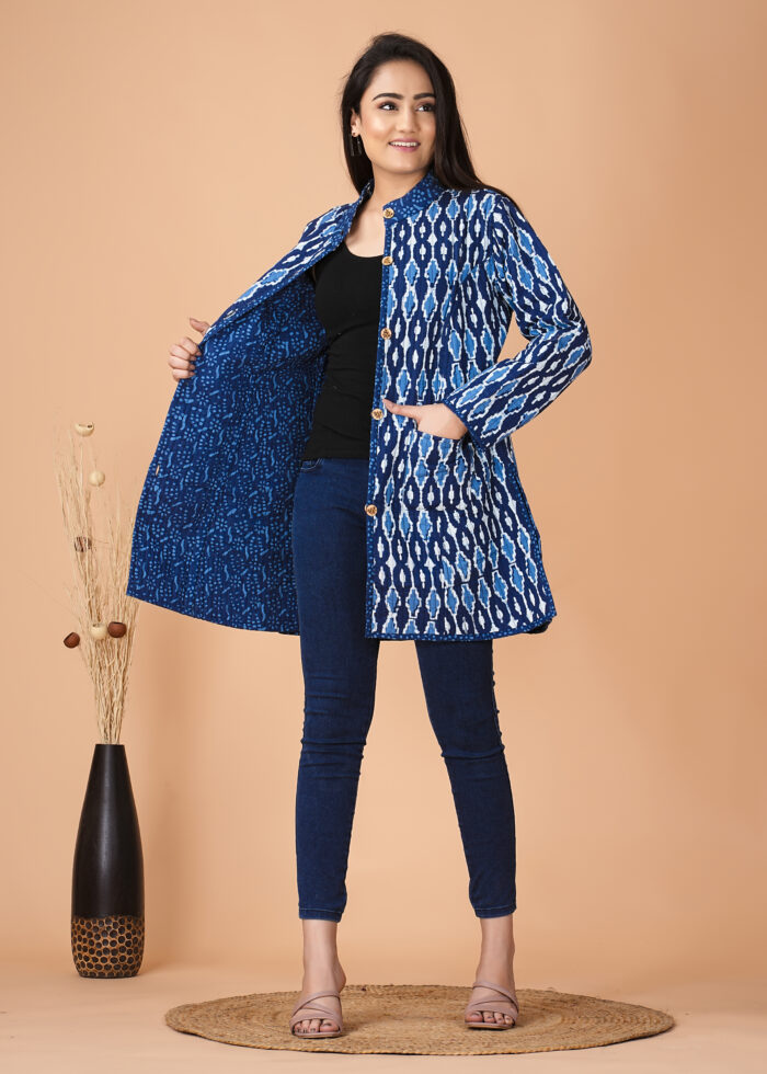 This is a handcrafted Bagru print reversible quilted jacket, Get Smart, Get Stylish with Cotton fabric , Inside Cotton and is prone to colour bleeding due to use of natural dyes. The print on the garment might be uneven- owing to the handcrafted nature of the product, adding essence to the garment.