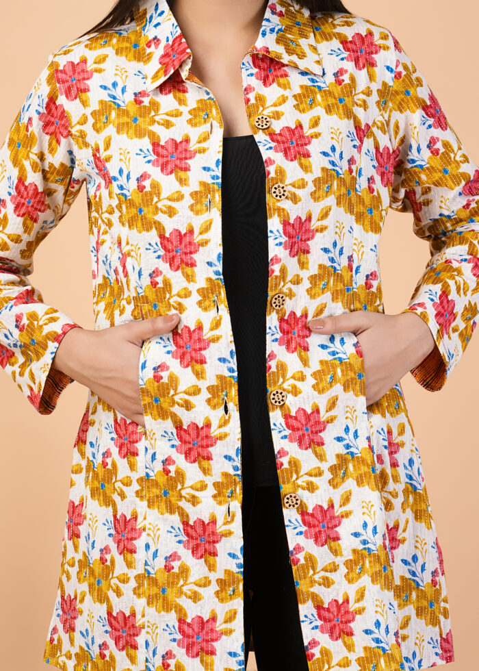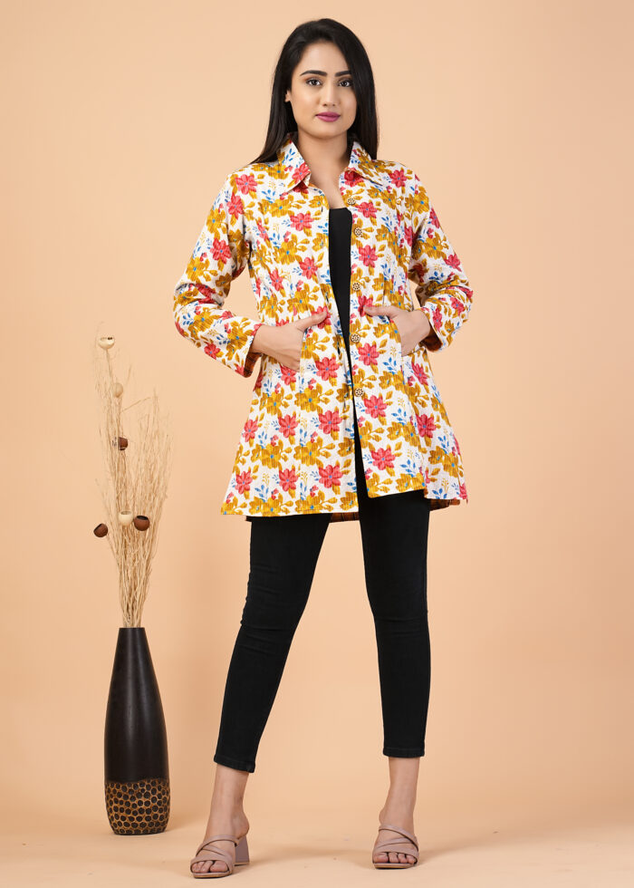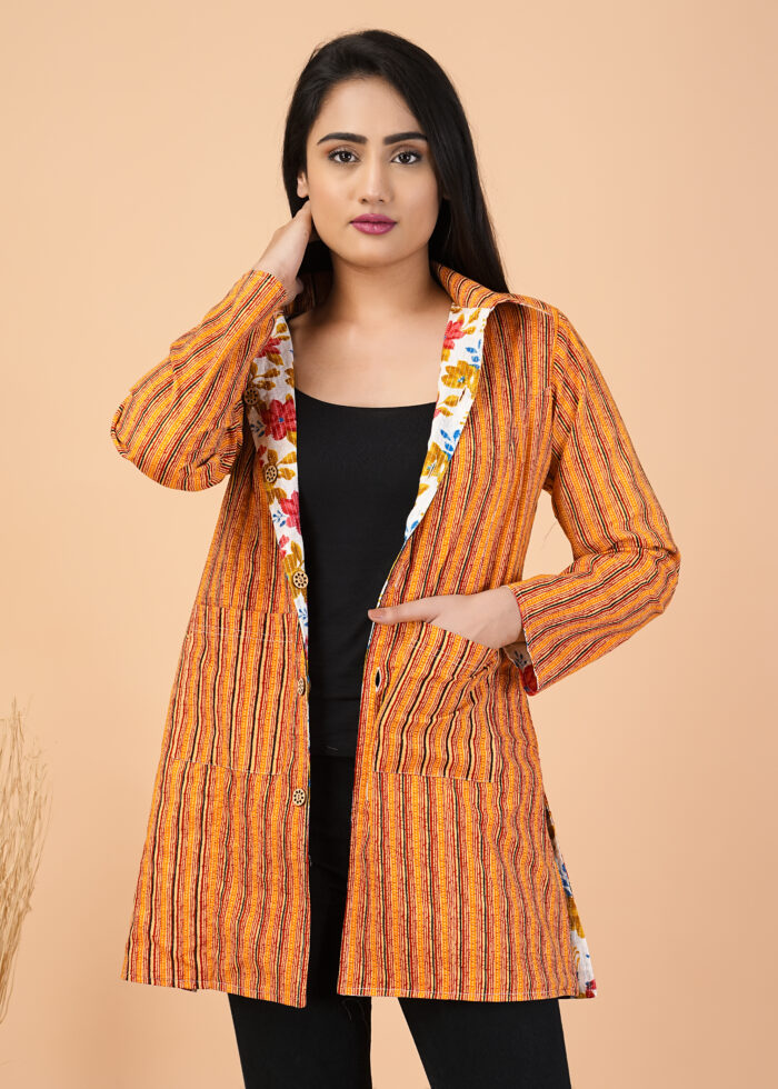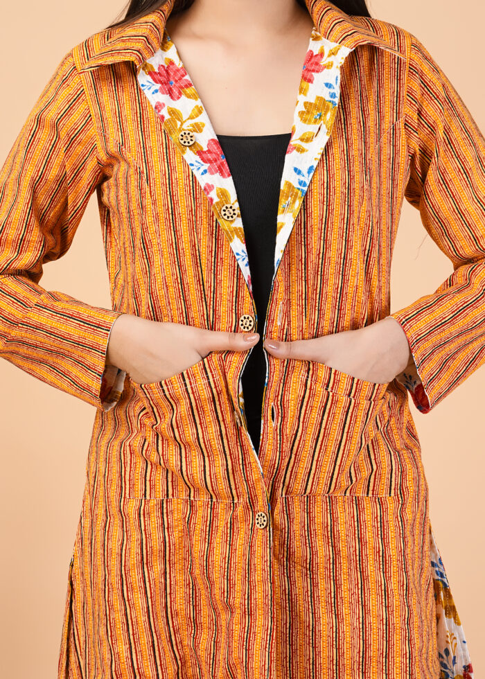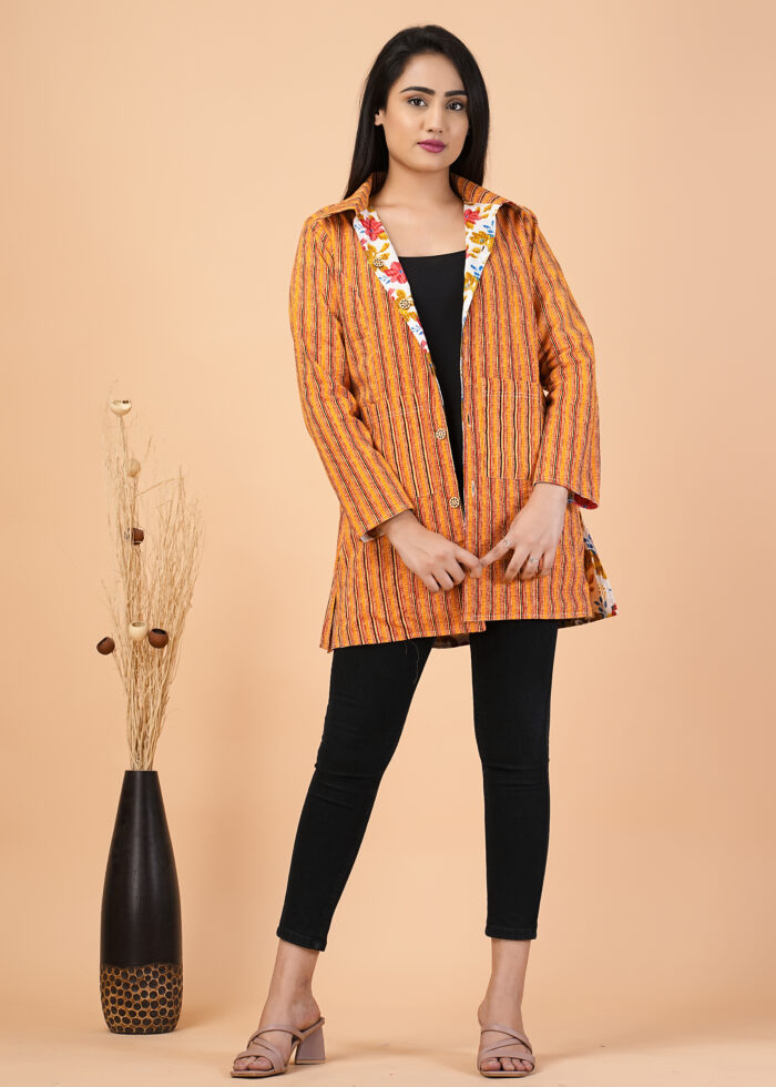 This is a handcrafted Bagru print reversible quilted jacket, Get Smart, Get Stylish with Cotton fabric , Inside Cotton and is prone to colour bleeding due to use of natural dyes. The print on the garment might be uneven- owing to the handcrafted nature of the product, adding essence to the garment.